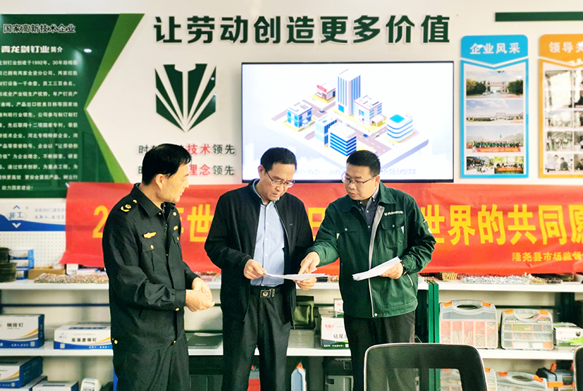 今年10月14日是第54屆世界標準日,主題為“美好世界的共同愿景”。為進一步推廣標準化理念,提高標準化意識,提升標準化總體水平,深入推進標準化戰(zhàn)略,10月12日,隆堯縣市場監(jiān)督管理局副局長張彥國給青龍劍公司送來釘類產(chǎn)品國家標準。