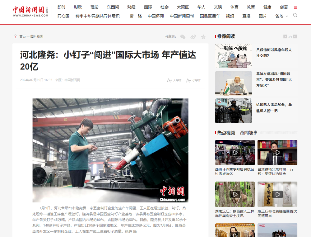 近日,中國(guó)新聞網(wǎng)記者走進(jìn)河北隆堯青龍劍釘業(yè)有限公司,對(duì)制釘車(chē)間的生產(chǎn)工序及車(chē)間環(huán)境進(jìn)行了解和拍攝。7月9日下午,青龍劍釘業(yè)榮登中國(guó)新聞網(wǎng)。青龍劍釘業(yè)將不斷探索、研發(fā)產(chǎn)品,通過(guò)技術(shù)升級(jí)、產(chǎn)品創(chuàng)新,為社會(huì)提供更高效、更安全緊固產(chǎn)品,提供更全面的基材連接緊固系統(tǒng)解決方案,樹(shù)立行業(yè)標(biāo)桿,助力國(guó)家建設(shè)![詳情] 2024-07-12 09:40:06